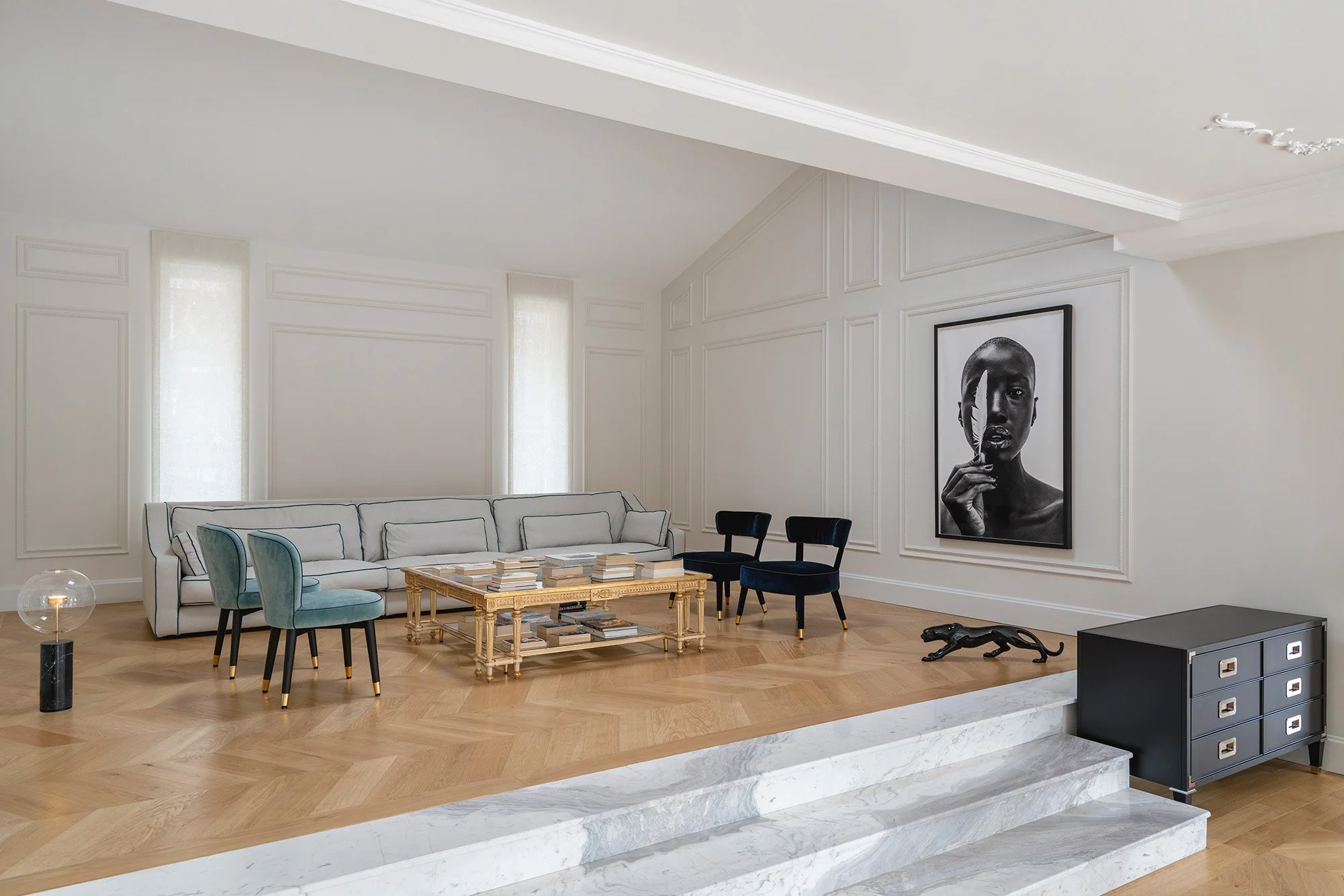 At its heart, a striking marble-clad staircase framed by a bespoke railing ascends to an upper floor, where a show-stopping light sculpture crowns the landing. Throughout the home, lacquered oak meets polished marble, creating a bold dialogue between texture and tone.